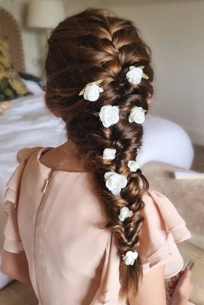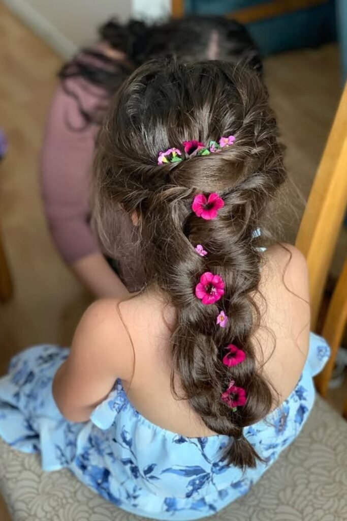 Soft petals tucked through a loose pull-through braid instantly turn it into a playful, fairy-garden style perfect for birthdays, outdoor parties.