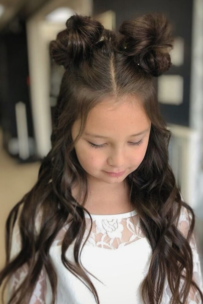 Playful energy comes through the moment those two high buns sit beside each other, making the style perfect for school parties, playdates, or any fun event.