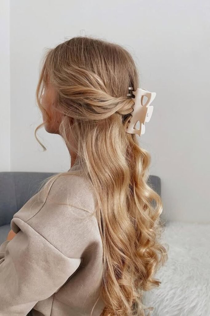 Soft movement stands out immediately with these loose waves held gently by a neutral claw clip, making it an easy pick for casual days or quick outings.