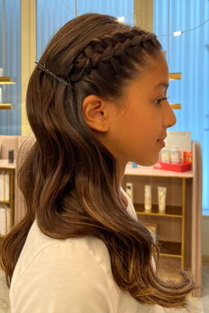A soft, flowy vibe shows up the moment the waterfall braid sits above those loose curls, making it a lovely option for school photos, family events.