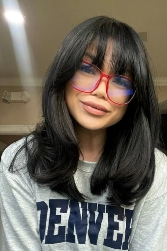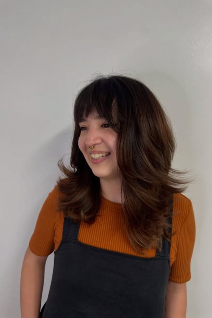 Volume gets controlled when the front carries the shape. Curtain bangs pull attention forward while layered ends keep thick hair from stacking up in the back.