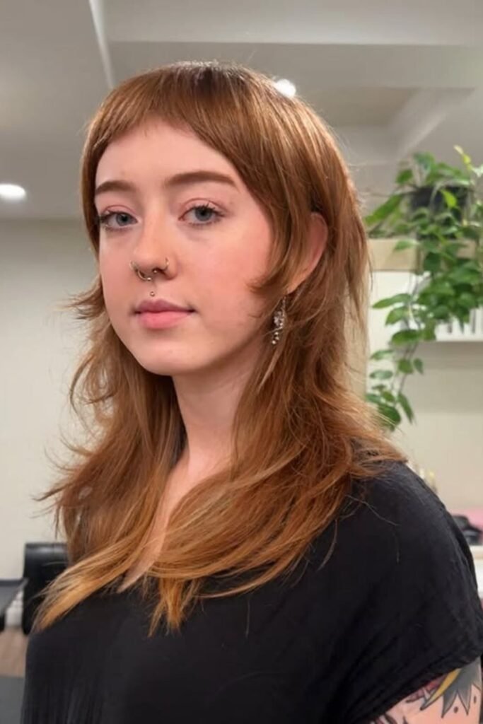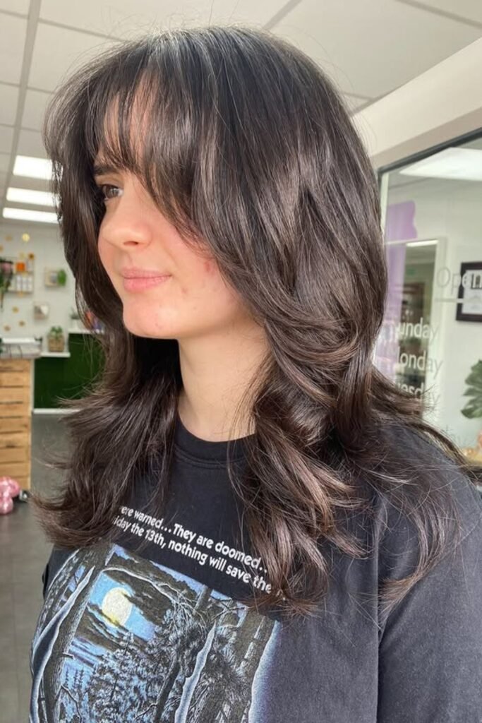 A short fringe keeps the top light, while lengthier pieces make up for the length. If you like a look that isn’t too polished, this is the ideal way to do it.