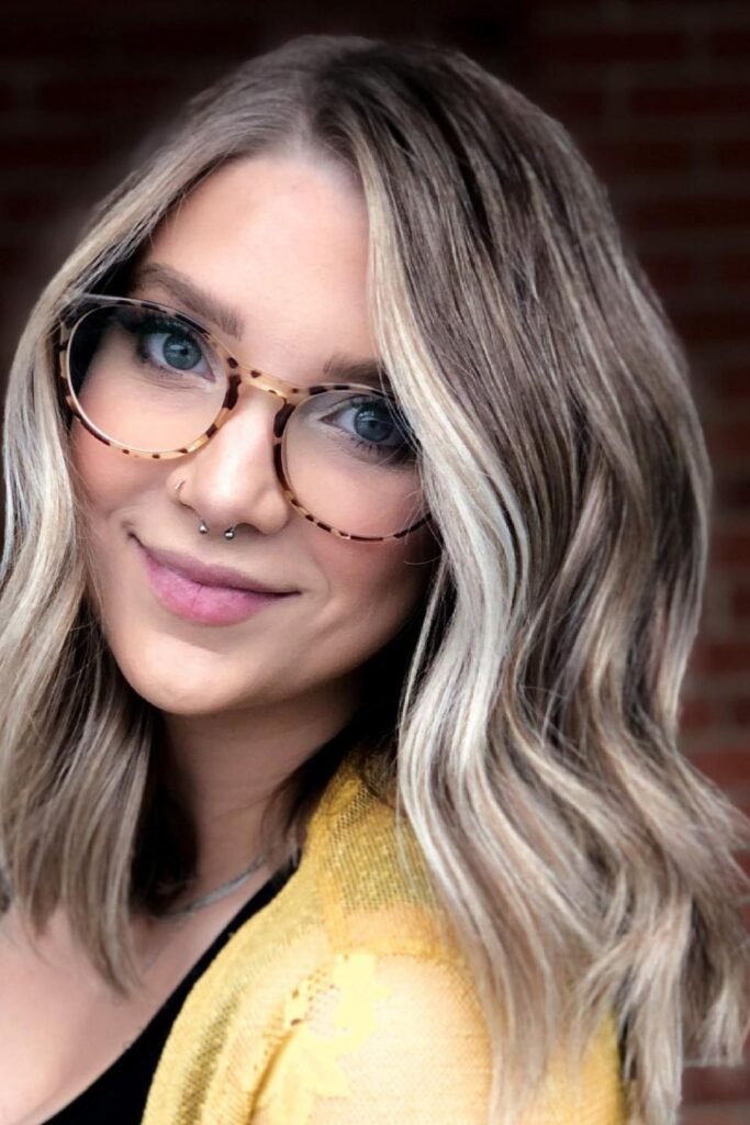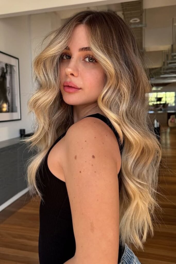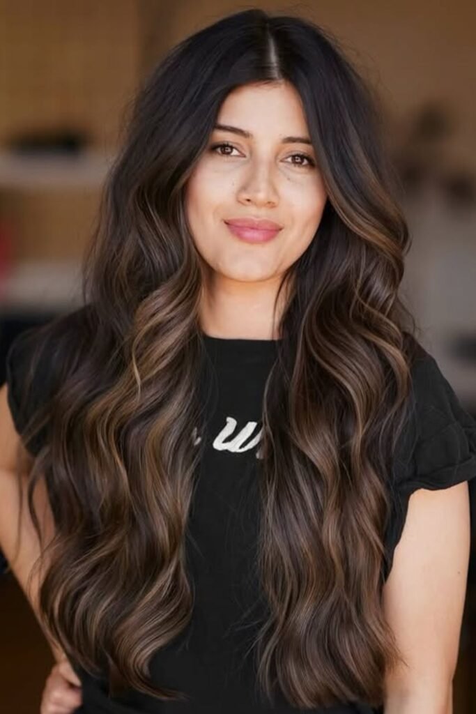 This works well for thick hair that feels flat but heavy. Get long layers with blended highlights, then style your hair with loose waves so the color and shape do the work.