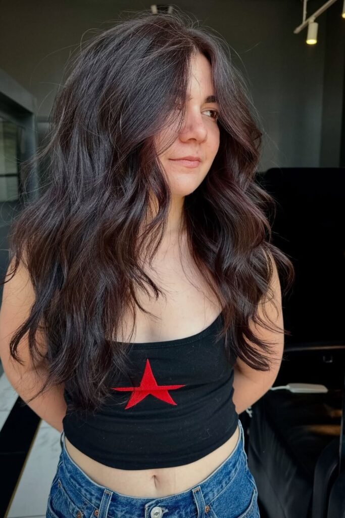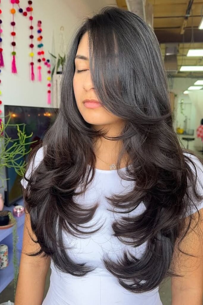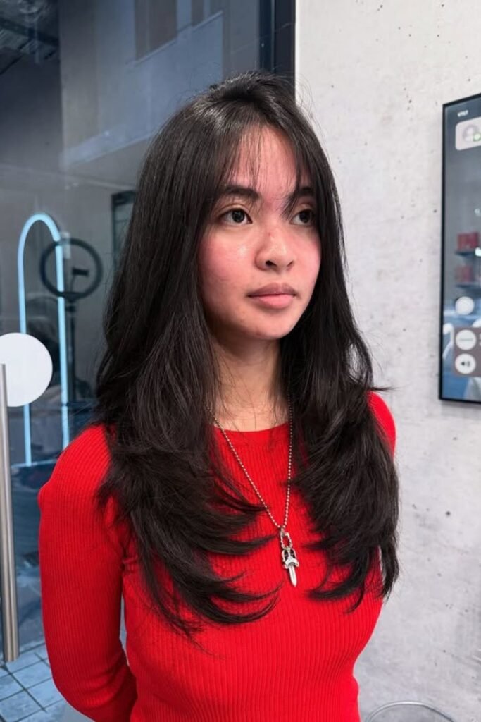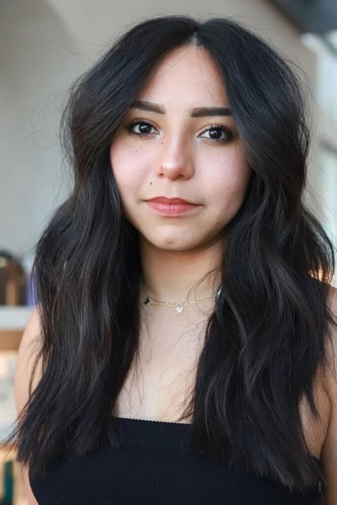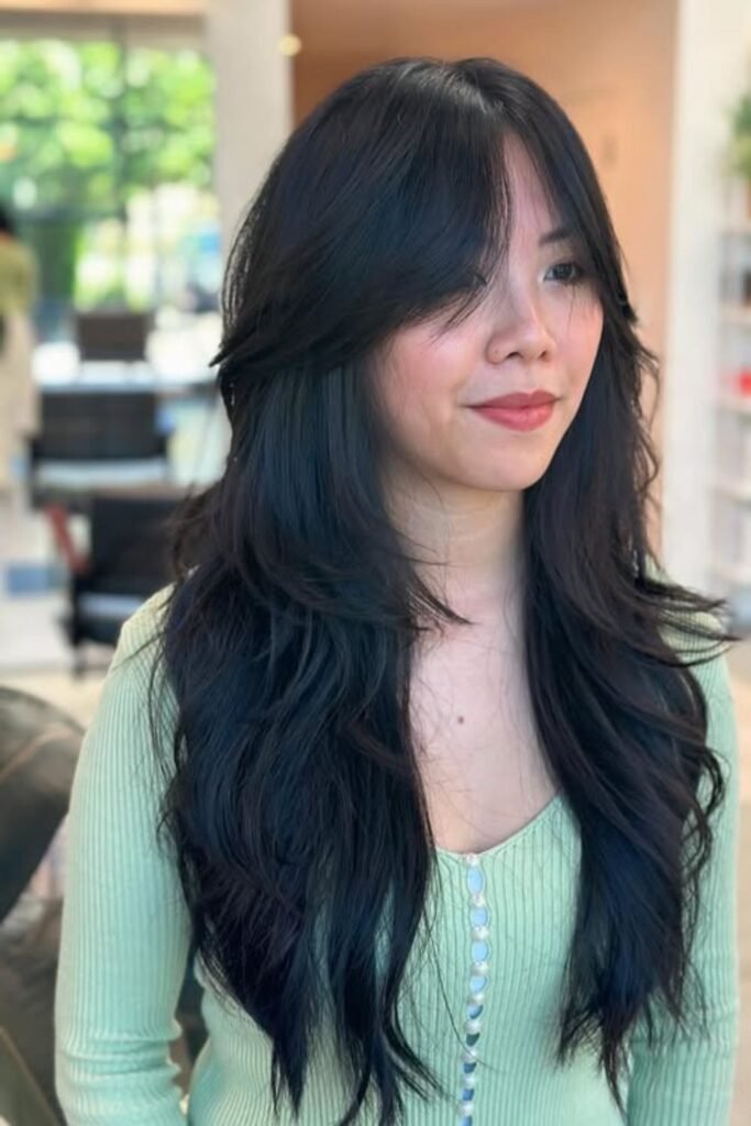 Extra weight can work in your favor when it’s guided the right way. Long layers help thick hair fall downward instead of spreading outward, which instantly makes it easier.