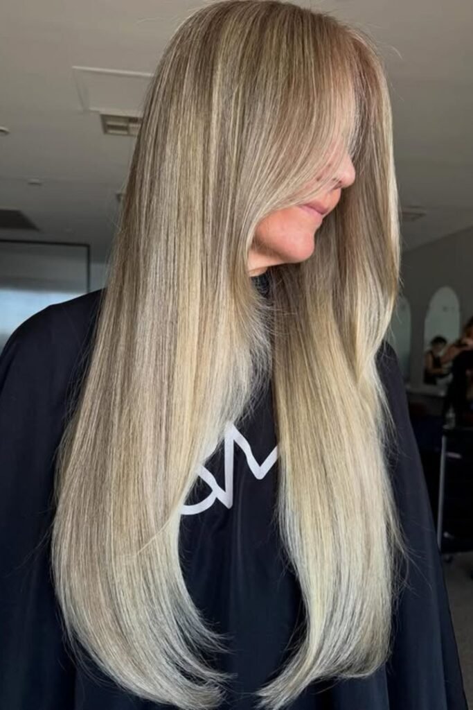 Lightness around the face influences how thick hair falls anywhere else. The wispy layers on the front soften it while keeping the length full, so the hair doesn’t seem heavy.