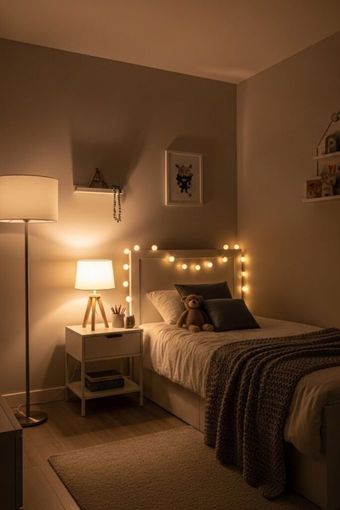 Soft colors help a kids’ room feel safe without feeling boring. A setup like this works best for kids who enjoy calm play, drawing, or quiet time before bed.