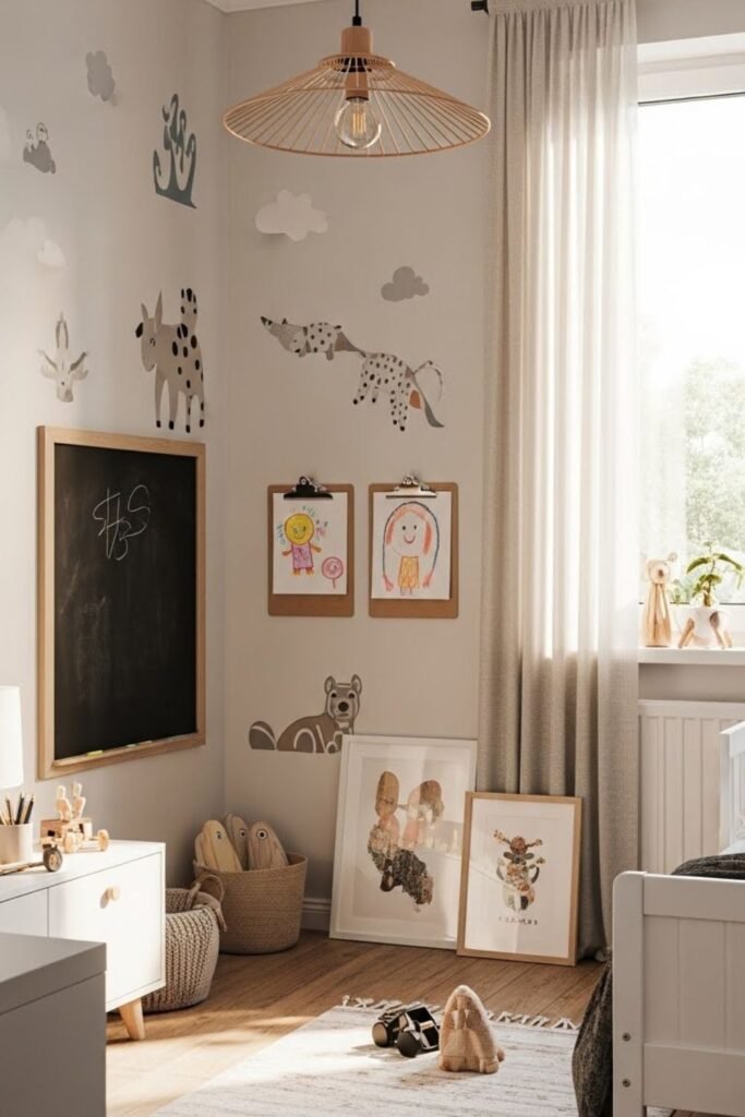 Walls don’t have to stay quiet. Turning one wall into an interactive imagination space works best for kids who love storytelling, pretend play or role play.