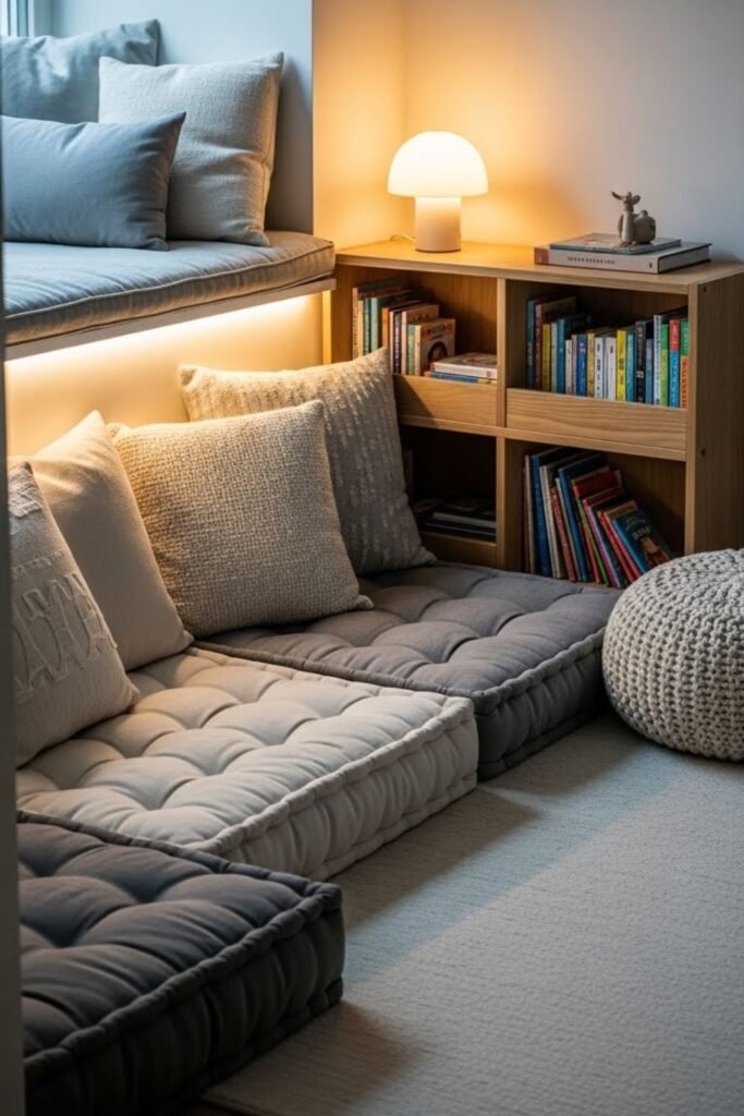 Floor cushions, a soft light and a handy shelf can turn reading from a task into a habit. Choose soft lighting and keep distractions to a minimum.
