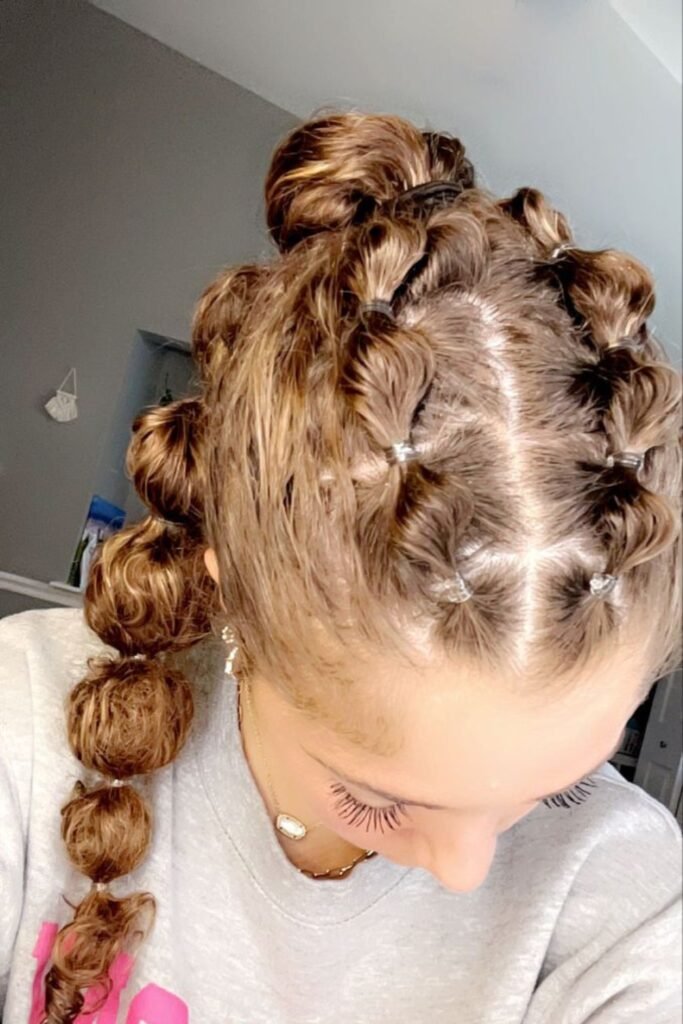 Start with a mid-length ponytail, add elastic every few inches, and gently tug each bubble to give it structure.