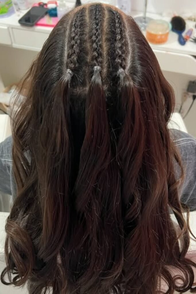Divide the hair into curved parts, securely braid each row toward the center, and wrap the base for further traction.