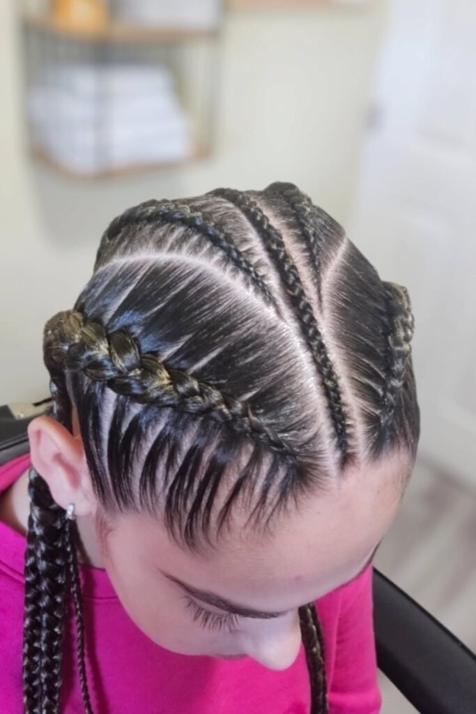 Every part is kept flat by the tight cornrow rows, and the thicker outer braids provide additional traction.