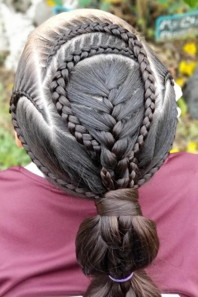 Middle braid neatly feeds into a secure ponytail, the top pieces are locked in place by the circular braid design.