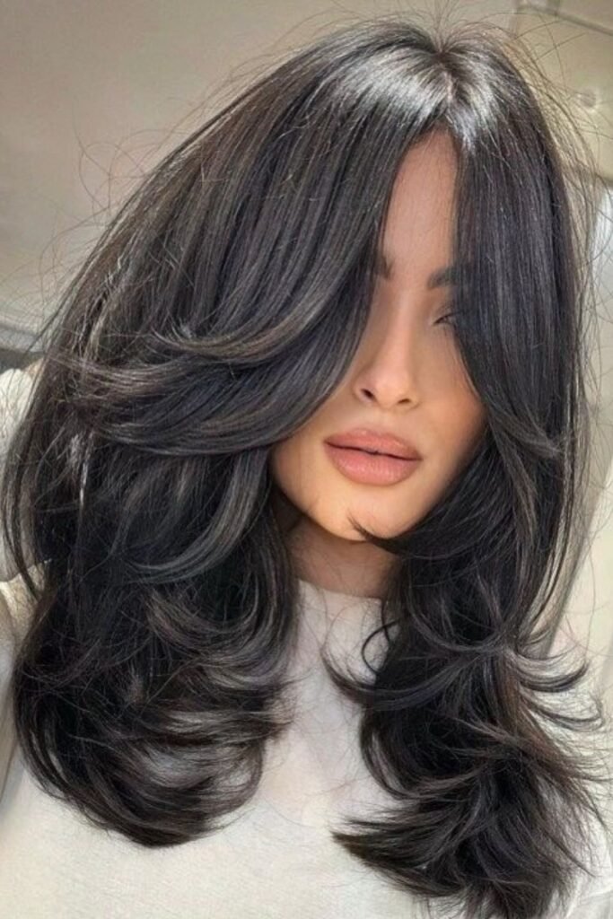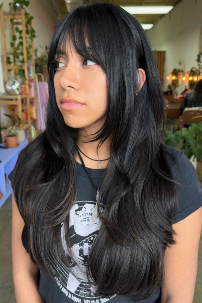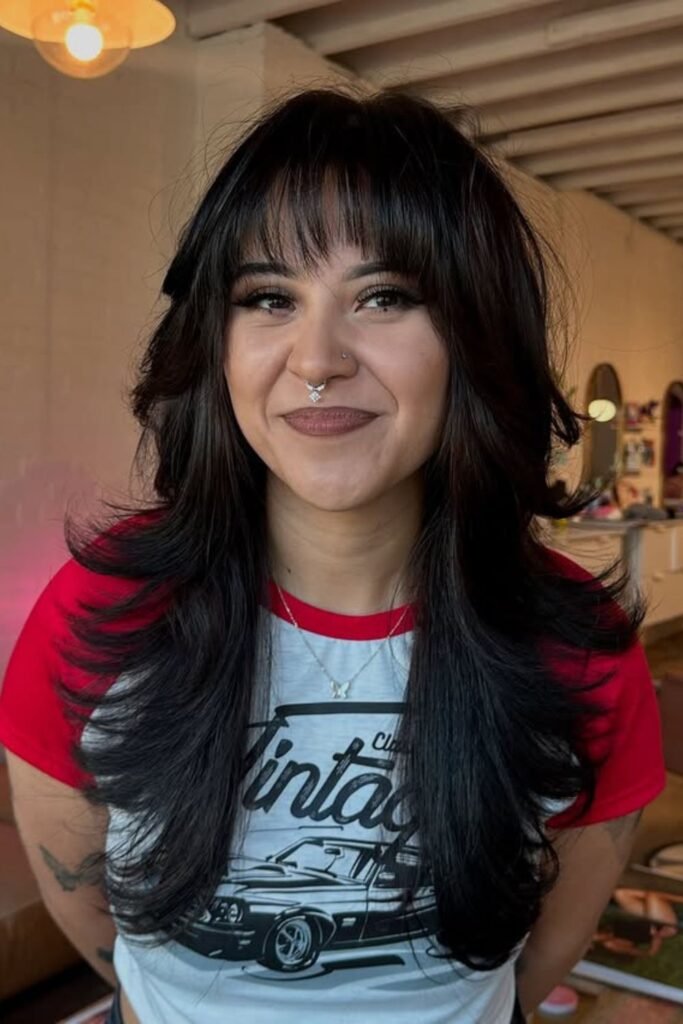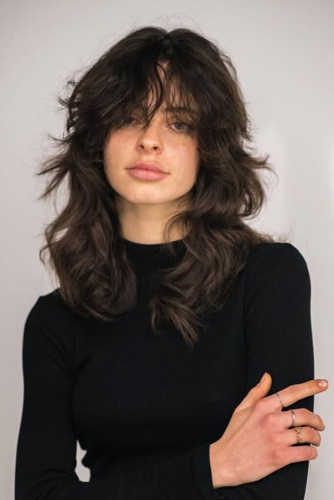 Long wolf layers blend well with deep curtain bangs, so this style works best for thick, straight hair that tends to feel heavy at the ends.