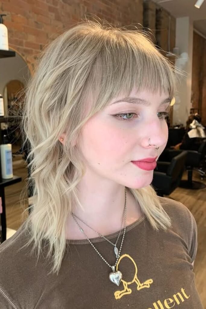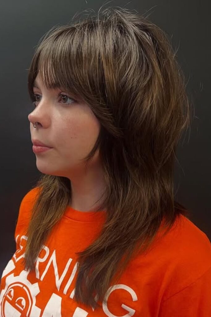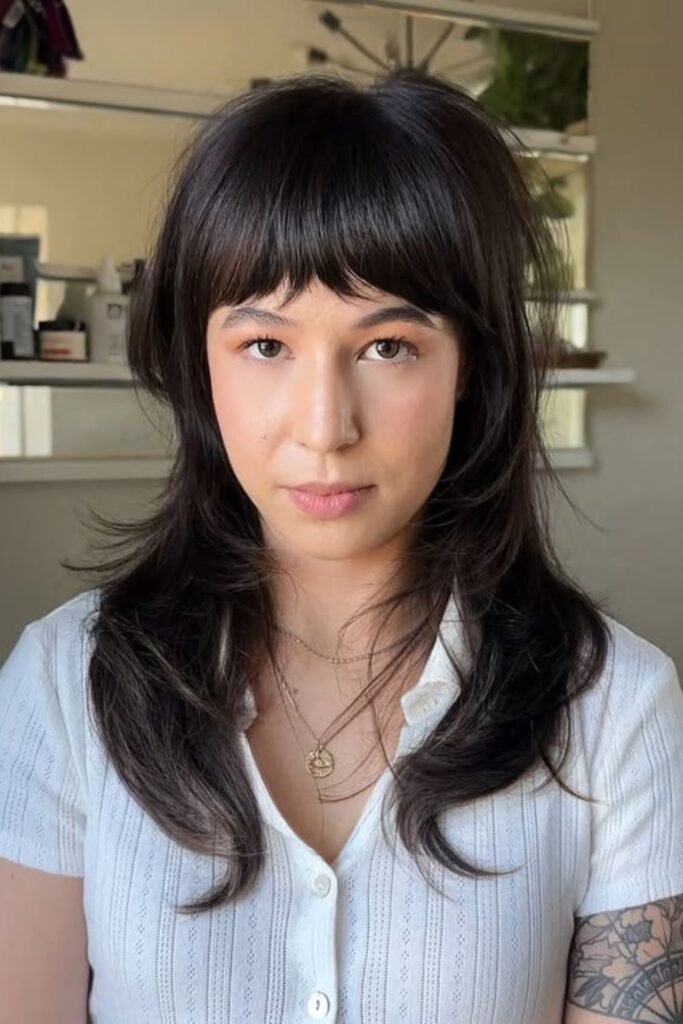 Long, silky wolf layers add volume to the bottom and gentle bangs keep the front from seeming flat.