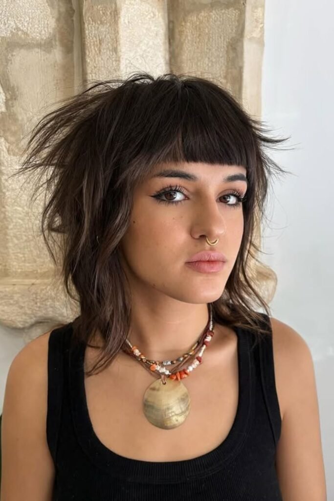 Ask for a wolf with textured fringe that goes down to your shoulders. Then, let it air-dry with curl cream and twist a few pieces in the front with your fingers.