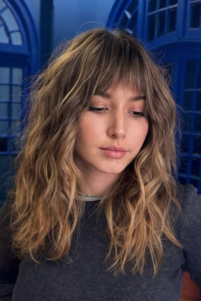 The long, feathered wolf cut keeps the crown full, and the loose curtain bangs make the face look softer instead of boxing it in.