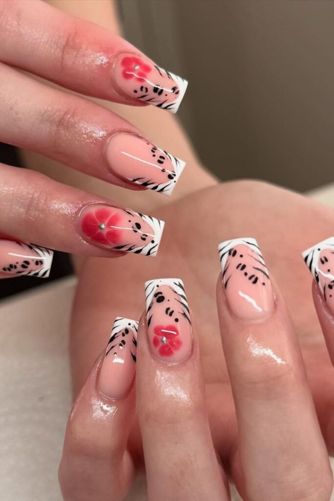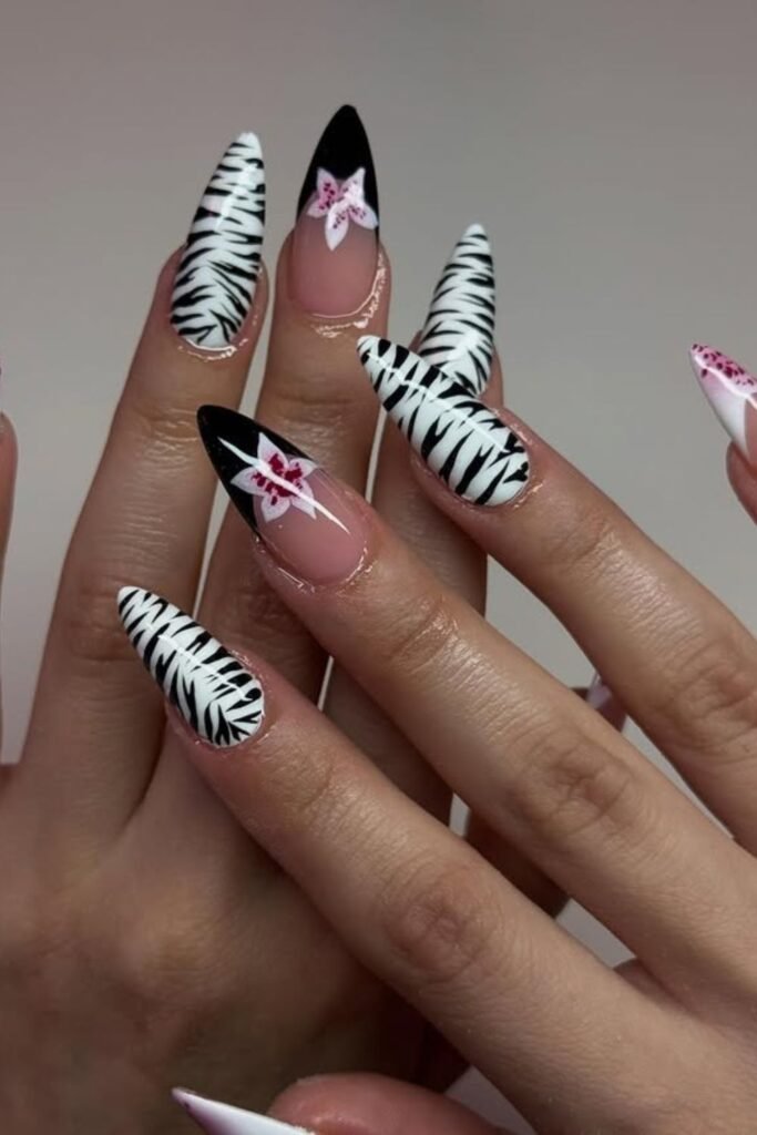 Sharp zebra tips meet delicate floral art for a striking yet feminine twist.