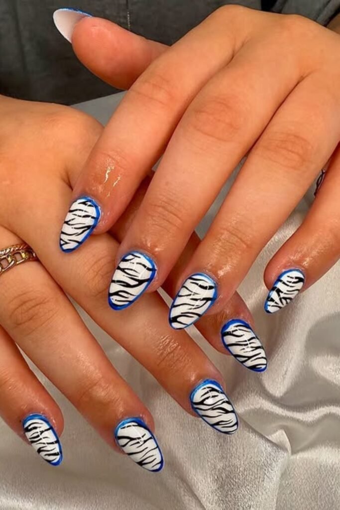 Electric blue outlines give classic zebra nails a bold upgrade that instantly stands out.