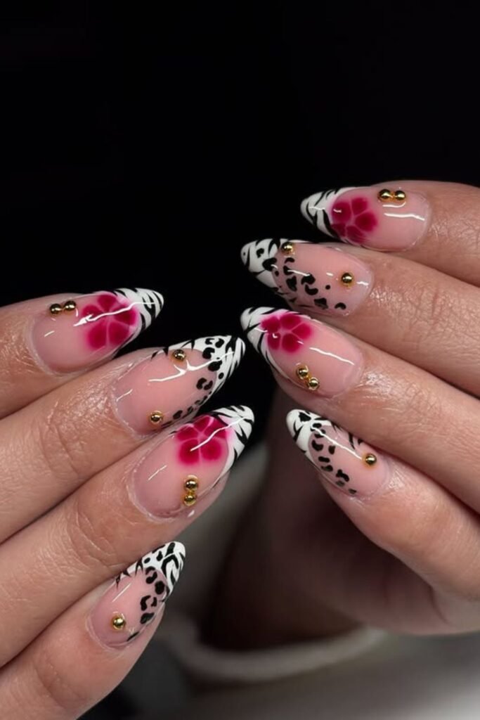 Soft zebra tips meet bold pink accents and tiny blooms for a look that’s equal parts edgy and feminine.