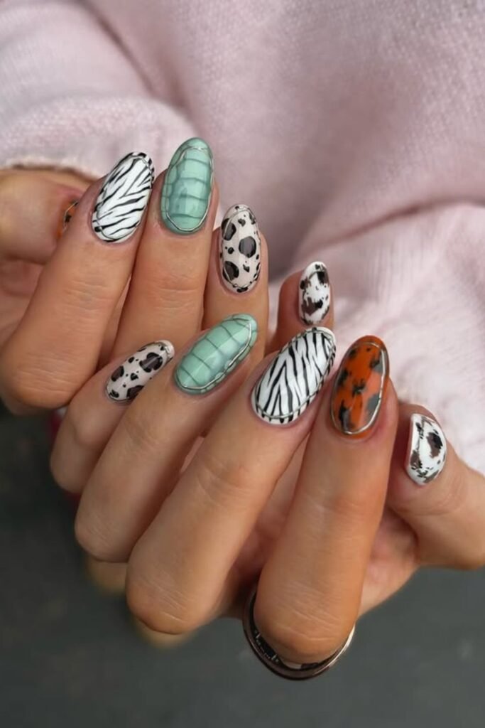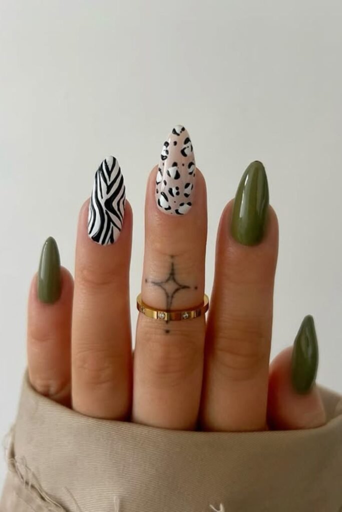 The mix of olive green, zebra stripes, and cow print nails is both stylish and down-to-earth, making it great for fall or days when you want to wear neutral colors.