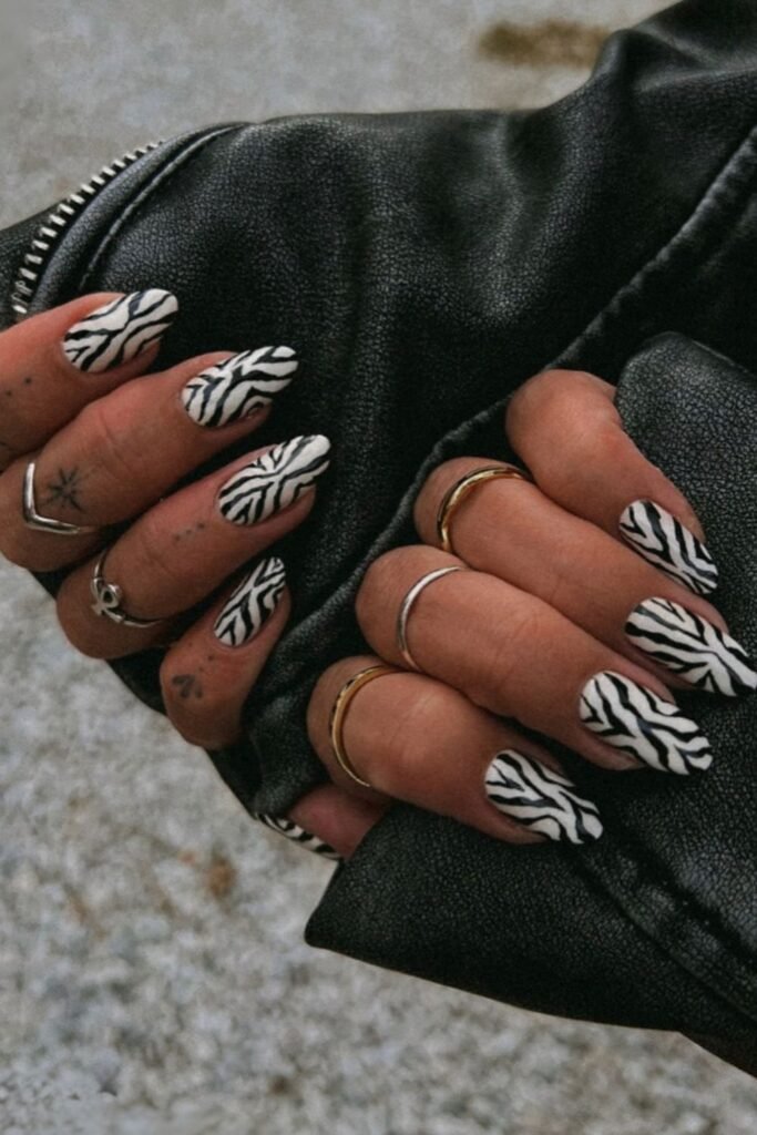 Matte zebra nails and a leather jacket are a match made for edgy style lovers.