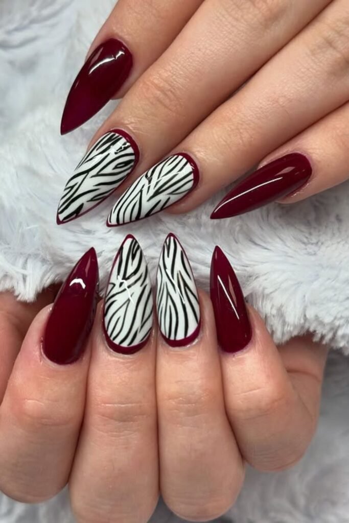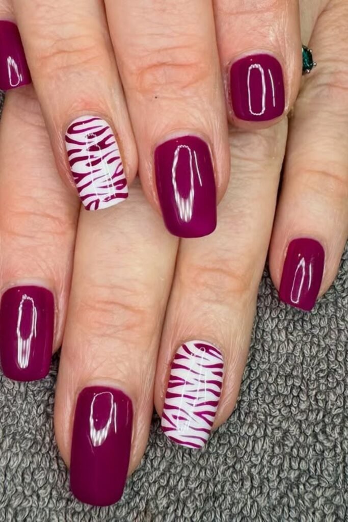 Deep burgundy polish gives these zebra nails a rich, luxurious edge that’s perfect for evenings or formal events.