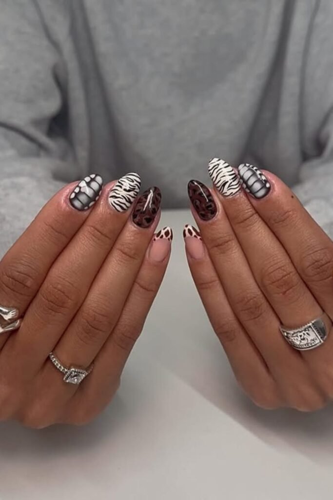 Earthy tones meet wild patterns in this chic safari-inspired manicure.