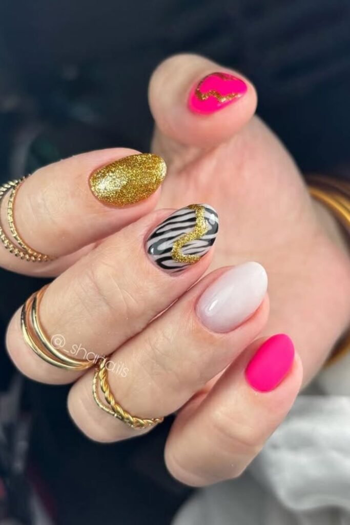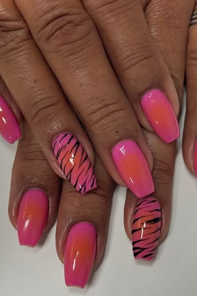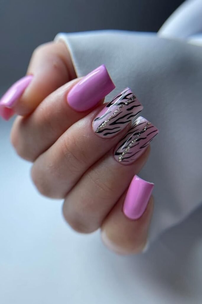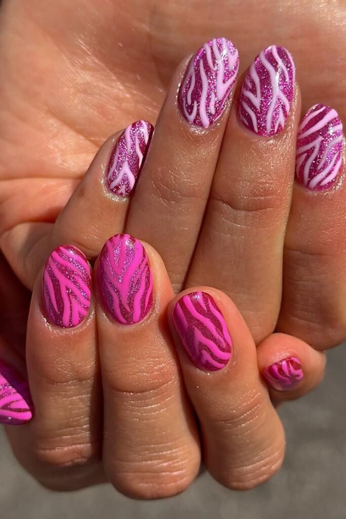 Bright pink zebra nails bring instant summer energy to your look. The pattern has more depth because it has both neon and glitter in it.