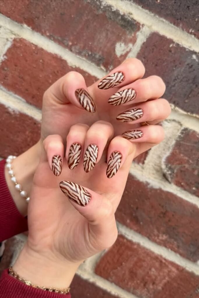 Warm copper tones give these zebra nails a cozy, autumn-inspired feel.