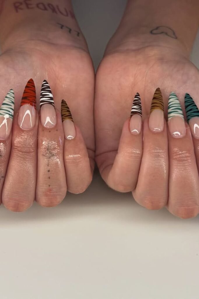 Each nail carries its own color story here from teal and mustard to rust and brown making this zebra-tip set a fresh, creative twist on the trend.