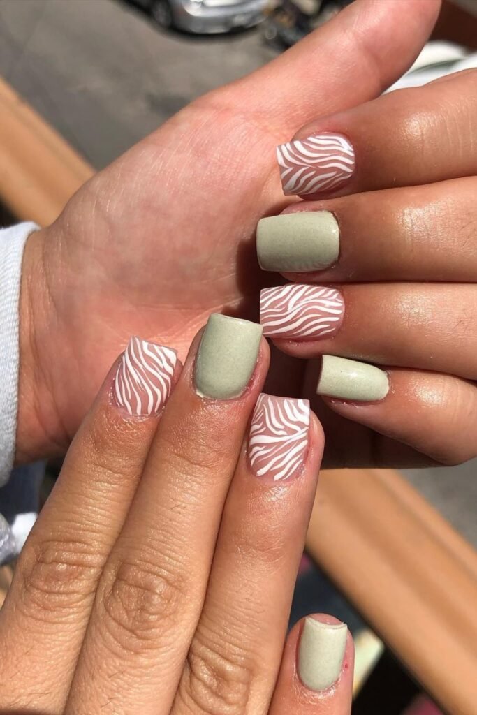To copy this look, paint your nails with matte sage and white zebra stripes on a pale nude foundation.