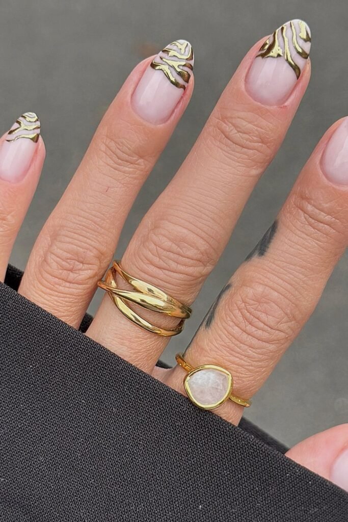 Metallic gold zebra tips on a nude base bring an instant luxe feel to this manicure.