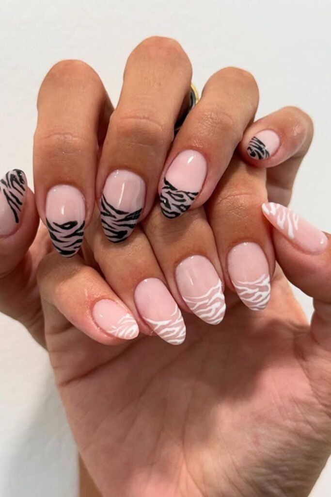 Soft nude nails with zebra French tips create a look that’s clean, modern, and easy to wear anywhere.