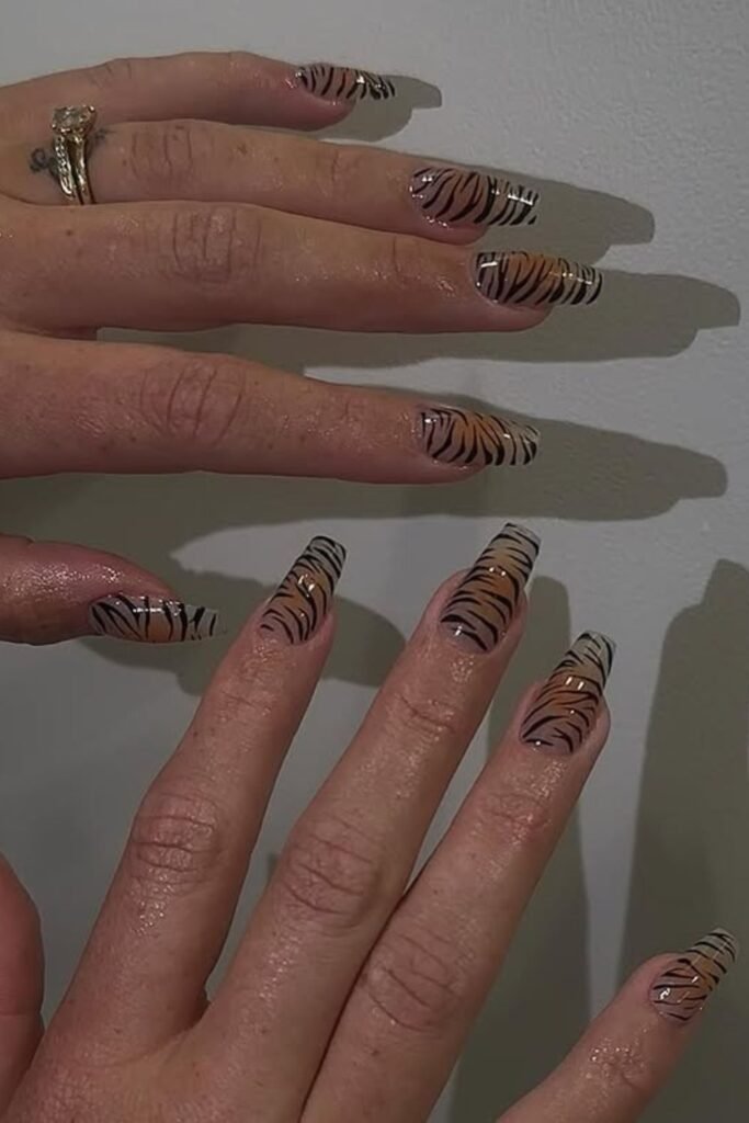 Warm amber tones meet zebra stripes in this chic gradient look that gives safari vibes with a glam twist.