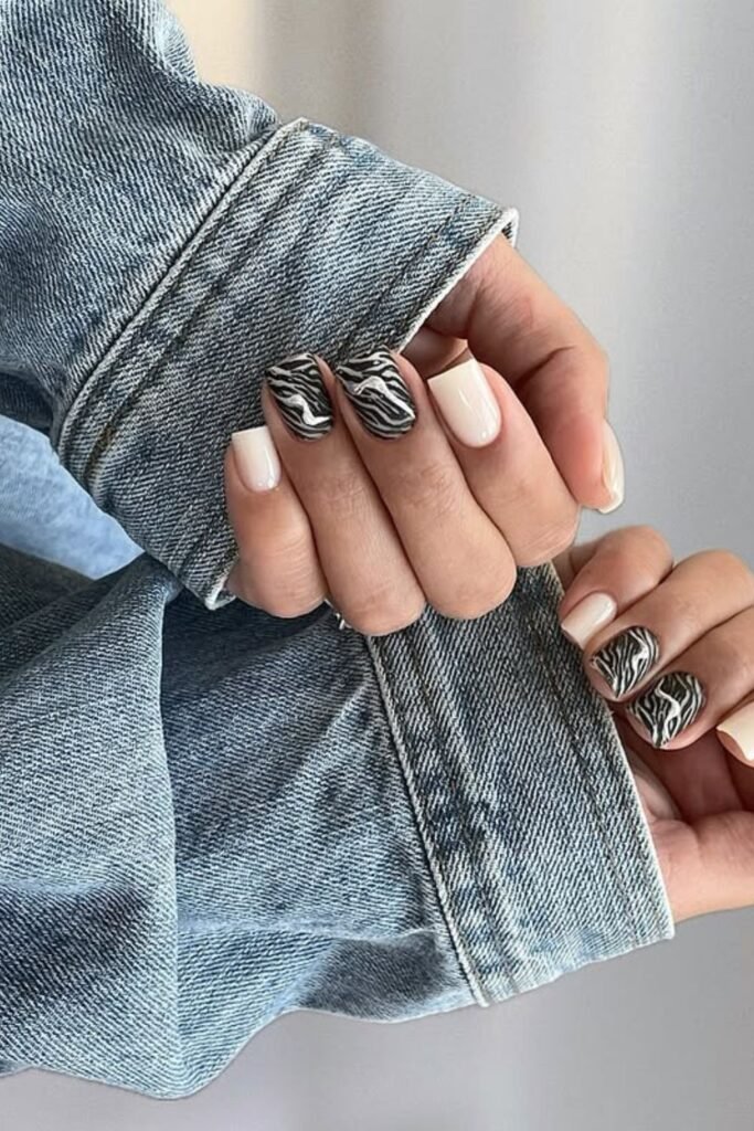 To do it again, paint most of your nails with pure white gel polish. Then, use a thin liner brush or a stamping plate to add black zebra lines to two accent nails.