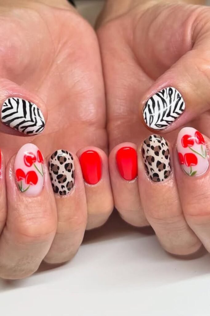 Playful meets bold in this mix of zebra stripes, leopard spots, red polish, and cherry art.