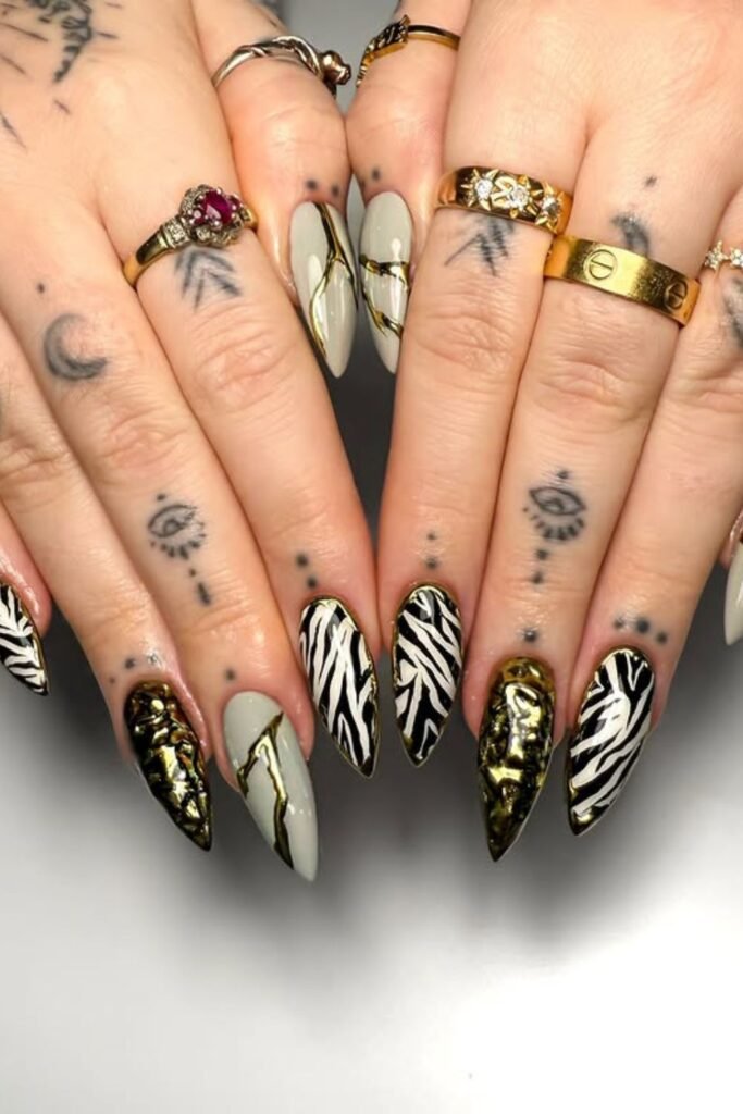 You can make this look again by using black and white zebra art on a few nails, chrome gold foil for texture, and taupe paint as a base color.